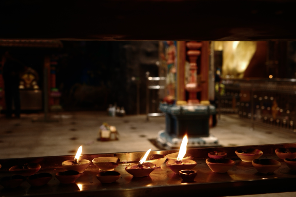 Tempel, Opfergaben und Rauch inmitten von bunten Götterfiguren die im Halbdunkel leuchten.