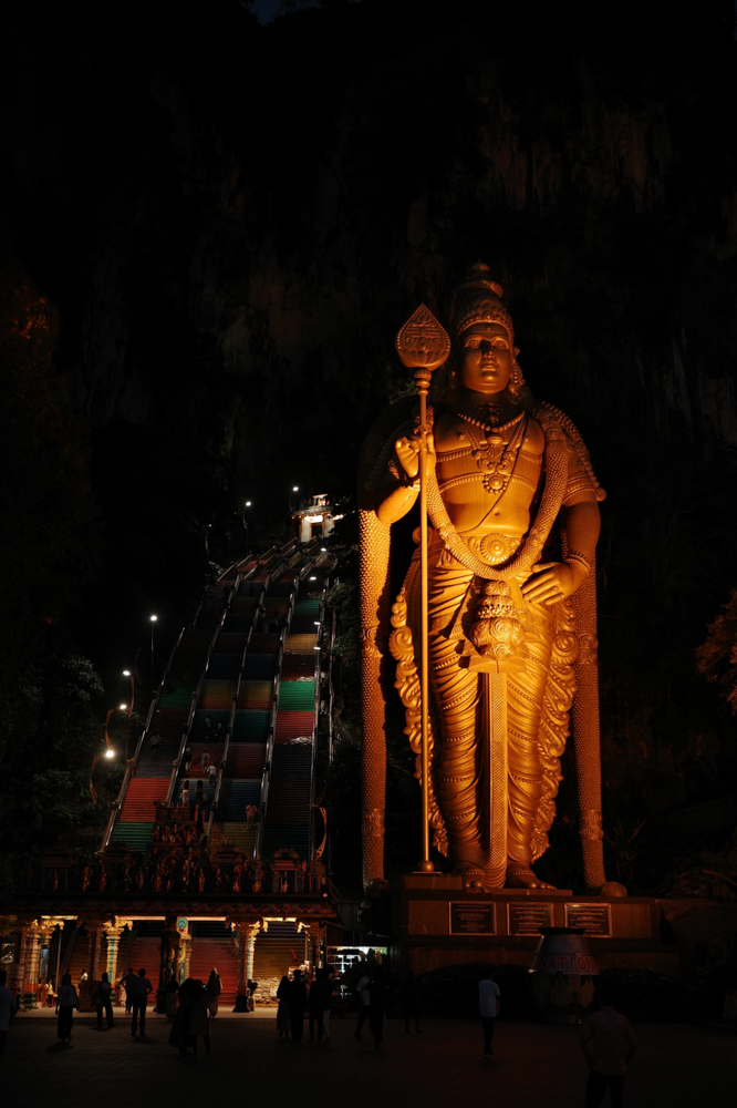 Die riesige goldene Statue von Murugan, fast 43 Meter hoch – wie ein Wächter aus einer anderen Welt.
